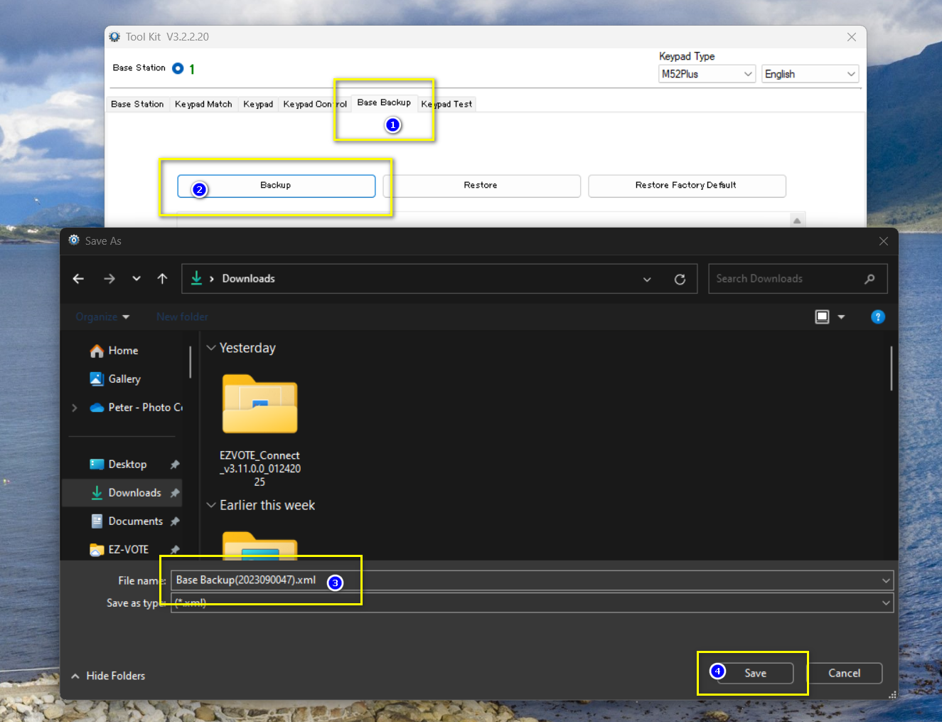 To backup the configuration (along with a "Match Code") of the primary base, open the Toolkit app, let it connect to the base via USB and navigate to the Base Backup tab. Then click Backup and save the (XML) file in a location where you will be able to find it later. You can rename the file, if you want, just remember that the name should be expressive of what it does.