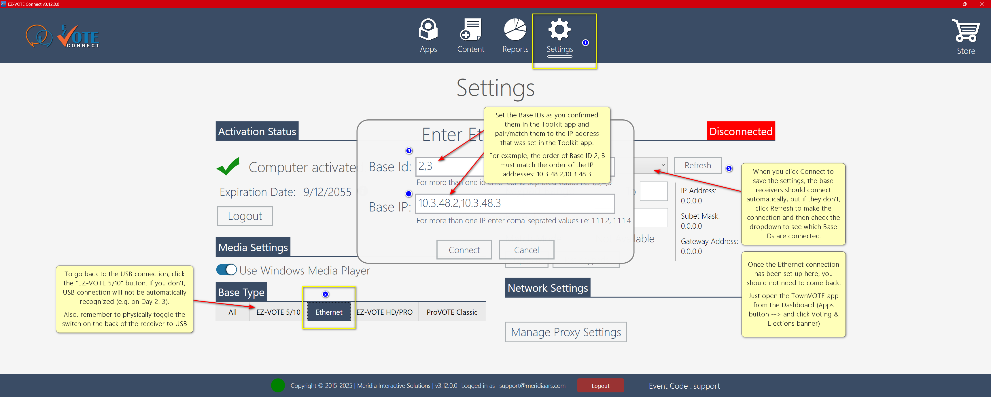 EZ-VOTE Connect Settings page (Ethernet connection) screenshot: