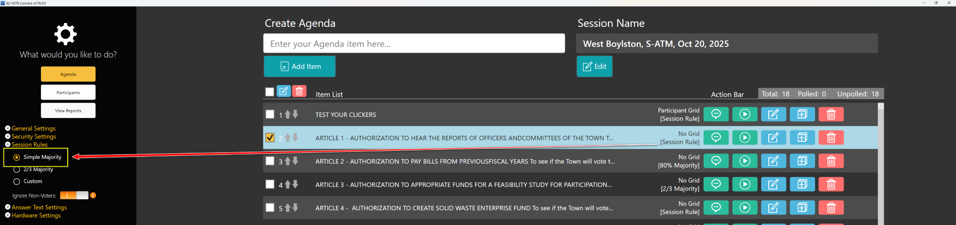 There are two voting rules areas: session-wide rule so that you don't have to edit each Agenda item individually, and a specific voting rule for those Agenda items that require a different quantum of votes calculation than the rest.