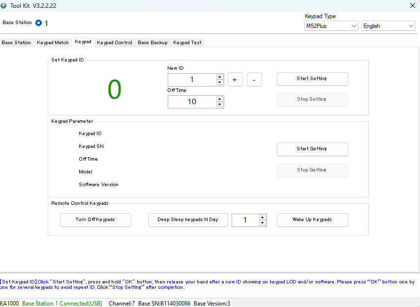 If you are unclear which ID number is set to a specific keypad, you can use the 'Start Getting' feature in the Keypad tab. After selecting this option, press the "Send" button (paper plane) and the Toolkit app will display the Keypad ID and other information under the "Keypad Parameter" section.