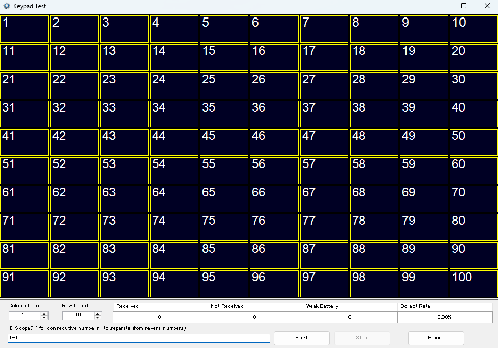 Navigate to the 'Keypad Test' tab (shown below). This opens a new, resizable window that you can maximize or resize to fit your screen. From here, you can set the 'ID Scope' and Column x Row count to set up the grid to fit your specific number of keypads.