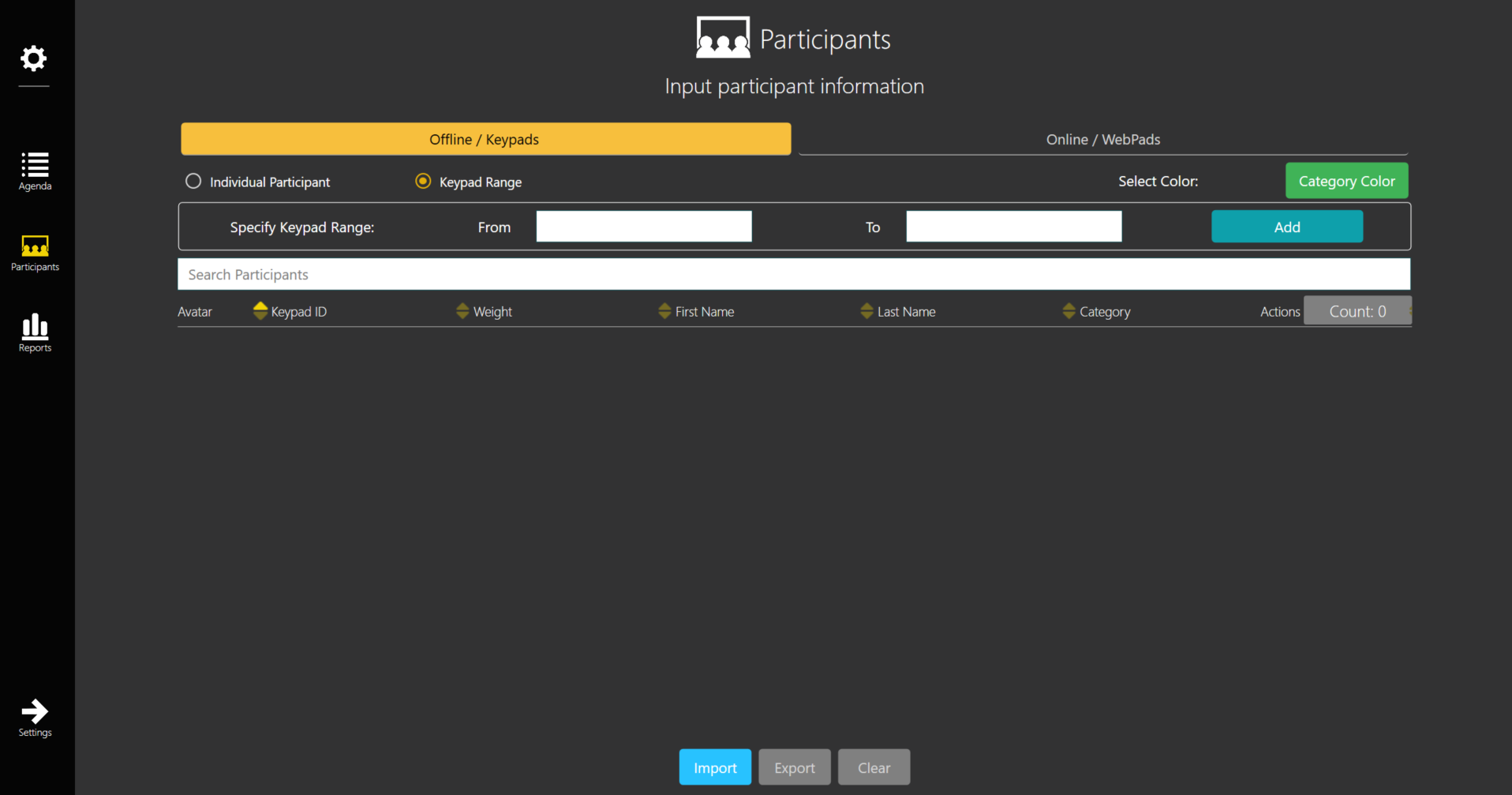 When you are ready to add participants to your session, navigate to the participants tab on the left-hand column. There are two menu options that can be seen at the top. You can either enter individual participants into the list, or you may select a keypad range. In order to set the keypad range, specify the keypad ID number range in the 'from' and 'to' fields. For example, if you set the range to include 1 to 500, the receiver will only receive votes from clickers 1 to 500. In some instances, such as a Representative Town Meeting in Massachusetts, might require individual participants. With the individual participant option selected, you will be able to type the first and last name of the individual, as well as the keypad ID you wish to be associated with that individual. There is also an optional 'category' field where you may enter information such as the participant's district. Once the information is complete, pressing 'add' will put the individual participant into the list. Once you have set up your participant list, you may sort by each category and doing so will adjust how the participants are displayed on the participant grid. When you have completed your participant list, you may export it as a .csv file by selecting the export button at the bottom of the page. After clicking the export button, you will be prompted with a "save as" popup menu, where you can save the file for later usage.