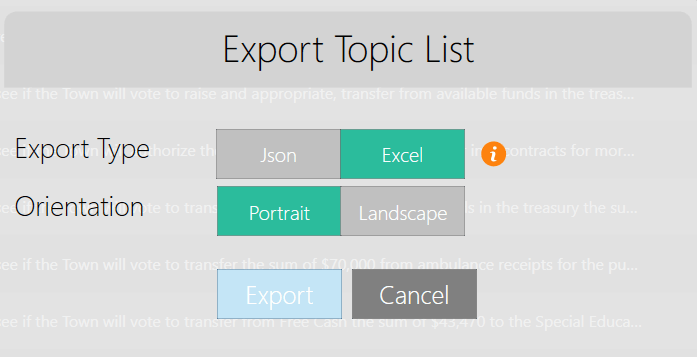 Start by creating or importing the .JSON file for your agenda. Then, when the agenda is completed, you can click on the export button of the agenda page. To print the agenda, you will want to choose the Excel file format when exporting. You will also want to select the Portrait orientation. Clicking export again from the pop-up window (shown below) will prompt you to save the agenda.