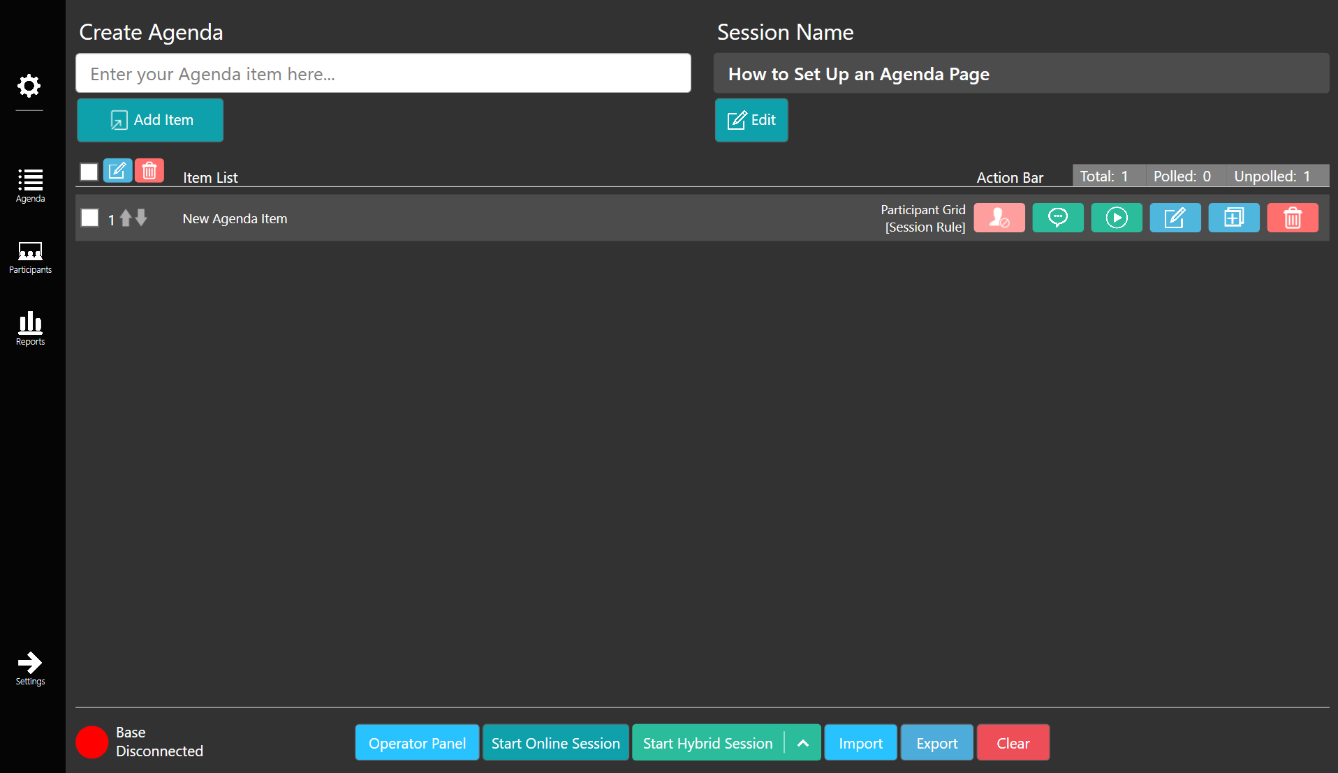 Start by naming your session by entering a session name in the top right and pressing save. Then, you can create your own agenda items to add to the item list in the create agenda field in the top left. Enter the name or description of your agenda item in the field and then select the add item icon to add the item to the item list below.