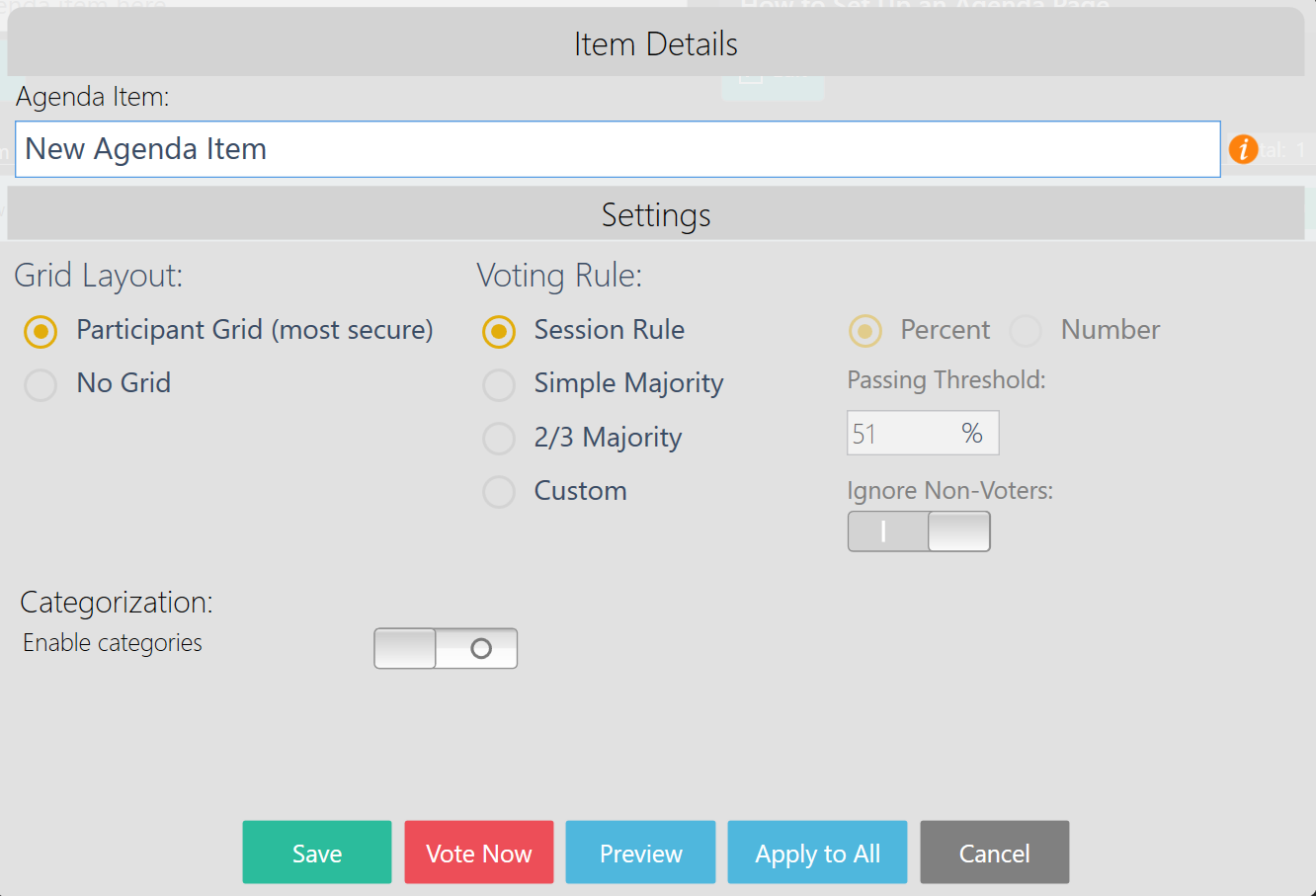 An item details screen will pop up after adding the item, where you can adjust the agenda item description, change the grid layout or voting rule. Save the details when you are finished, or you can select apply to all to adjust the details of all agenda items. Once the agenda item is added to the item list, you may press the duplicate topic button and edit topic buttons in the action bar on the right side. Sometimes it might be easier to duplicate the item and change the name to create a new item rather than add an item from the create agenda field in the top left. With multiple agenda items in the list, you may multiselect agenda items by checking the box to the left side of each item. This will allow you to quickly delete or edit multiple agenda items. You may also reorder the items by clicking the up and down arrows on the left side of each agenda item.