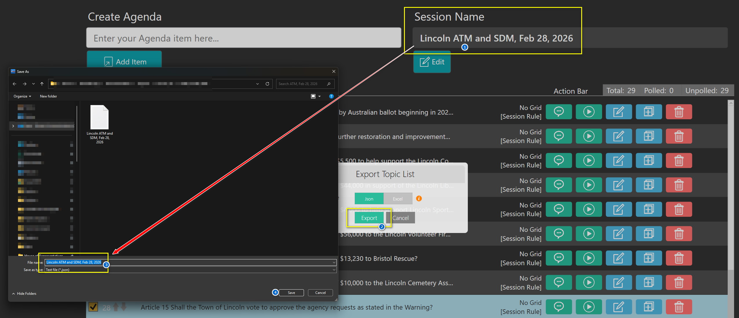 Exporting as a JSON file is ideal if you wish to import the file back into TownVOTE for later usage. Remember that your file name will be the same as the session name in TownVOTE. You may also import an excel file if desired.