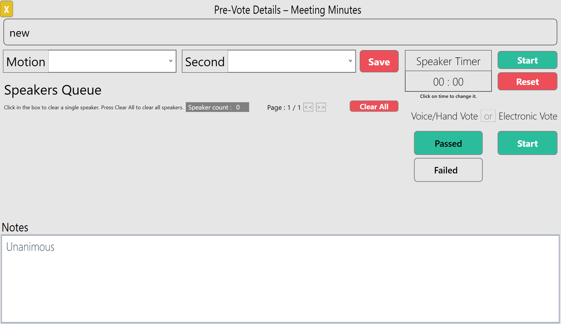 By selecting the pre-vote icon, you will bring up the pre-vote details screen (shown below). You can see in the middle towards the right side a Voice/Hand Vote section where you can click whether or not the vote passed or failed. It may also be helpful to include notes in the notes text box at the bottom. For example, if there is a unanimous vote, it may be useful to indicate that as I have done below.