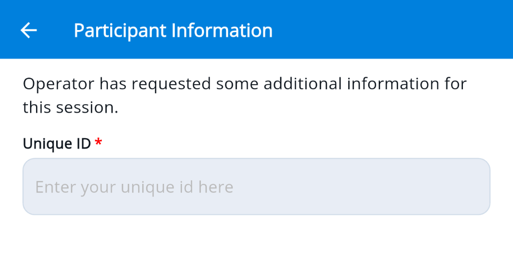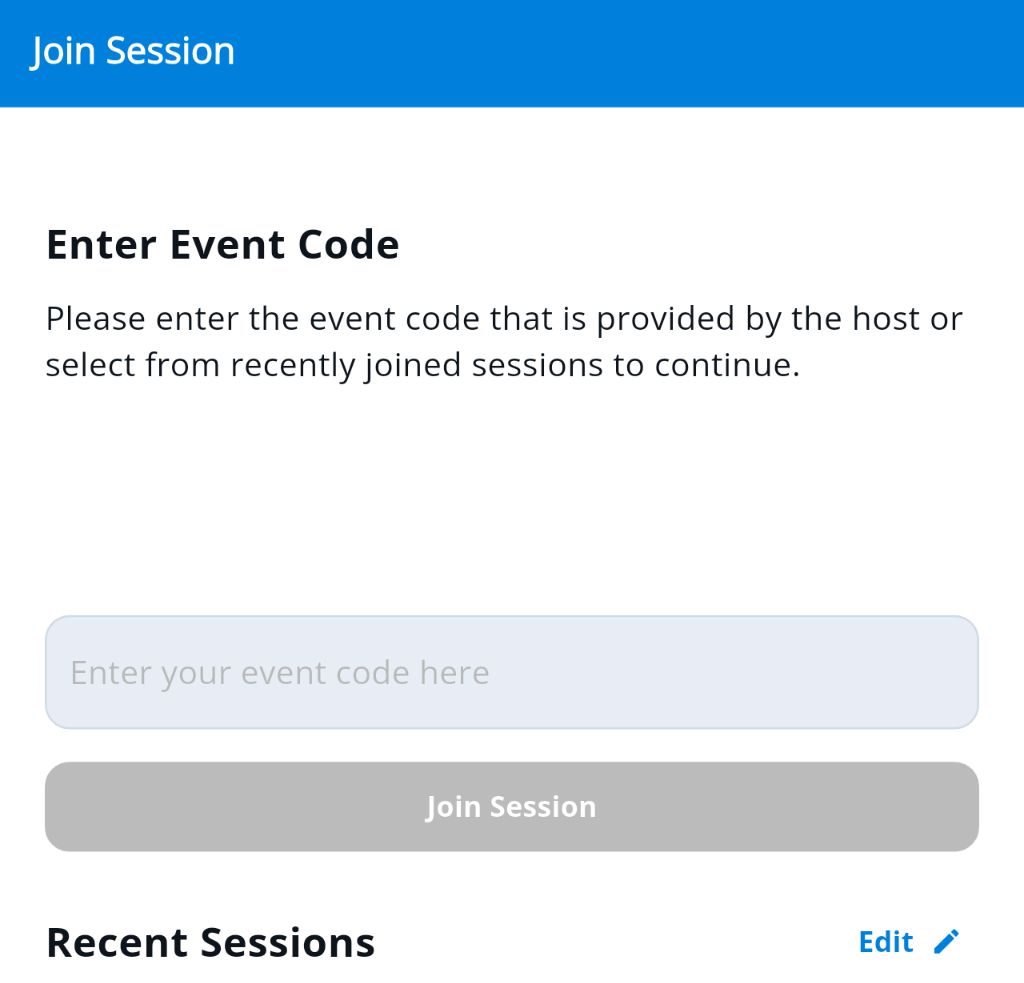 After opening the app or webpage, the user will be prompted to enter the event code, also referred to as a join code.