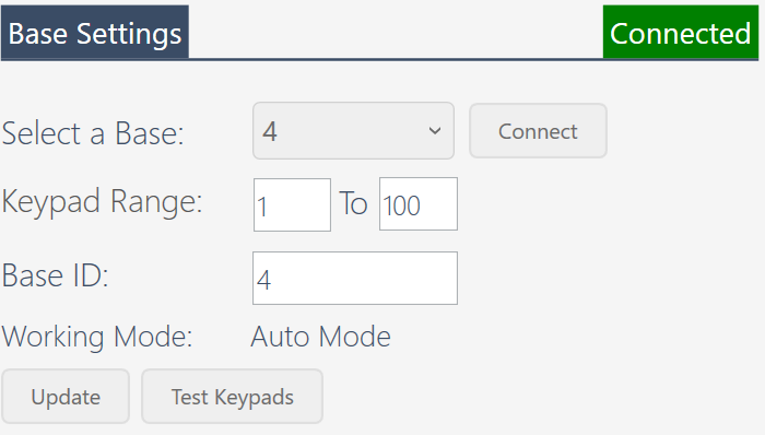 - If your receiver is showing two lights and the modes match on the back of the receiver as well as toolkit, then you should check the Base settings in EZ-VOTE Connect. Selecting the connect icon on the right side will start connecting the receiver to the computer. When successfully connected, the base id will appear in the "select a base" field and if you are using multiple bases, use the dropdown menu to toggle between them. You may change the keypad range here, which will decide which keypad ID numbers can vote on each receiver. If you wish to change a base's ID number, type a new number into the base ID field. Make sure that you select the update icon to save your changes. The auto mode working mode means that the receiver will receive signal from all of the keypads within the keypad range. If your receiver is set to a match mode working mode, then only the keypads matched to the receiver will cast signal. If you have more questions about the working mode, contact us at support@meridiaars.com or visit this article on how to match keypads to a receiver.