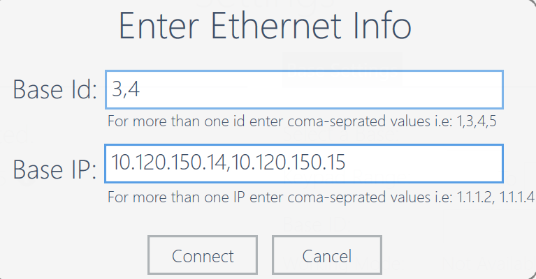 - IF USING ETHERNET MODE: The user will be prompted with the ethernet settings popup menu when selecting the ethernet base type. Make sure that the correct IP address is specified within the "Base IP" field. If you are using multiple bases, you must input each IP address in the same position as they appear in the base ID field above. For example, if the base ID 1 is the first to appear on the list, then the first IP address below should be the IP address of the first base. In the example below, the IP address for base 3 would be the first number in the base IP field; 10.120.150.14 and the IP address for base 4 would be 10.120.150.15.