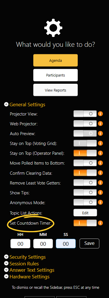 Starting in EZ-VOTE Connect v3.18, you can find the countdown timer settings in the general settings dropdown menu from the settings sidebar in TownVOTE. To enable the countdown timer, click the toggle to the right of the "Set Countdown Timer" setting. Enabling this setting will allow you to edit the clickable hours, minutes and seconds fields. Edit the fields to change the length of the countdown timer to your liking and click the save icon when you are finished.