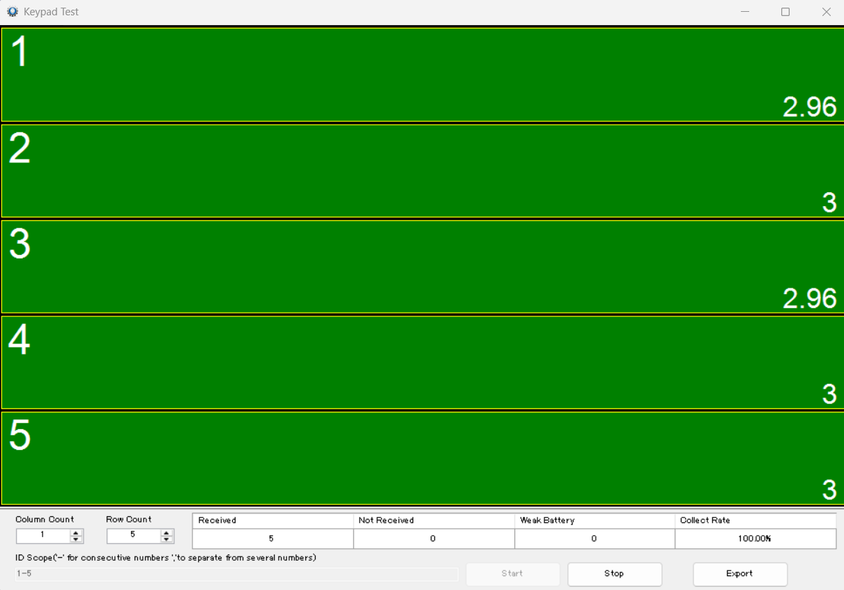 After successfully connecting to your base, navigate to the "Keypad Test" tab on the right side. This will bring up a new, scalable window showing keypad ID numbers on a grid. You may adjust the keypad IDs shown on the grid by adjusting the ID scope in the bottom left, as well as the column count and row count. I have adjusted my grid to test keypads 1 through 5 by making the ID scope 1 through five, the column count 1, and the row count 5. Now that my grid is set up, I will press the start button to start pressing the keypads. Now, after pressing any button on the keypad to wake them up, they are illuminated green on the grid, and the keypads display an "OK" as well as a "T" on 5 button models. Green means that the keypads are working successfully while a red indicator shows keypads with weak batteries. My successful test window can be seen below.