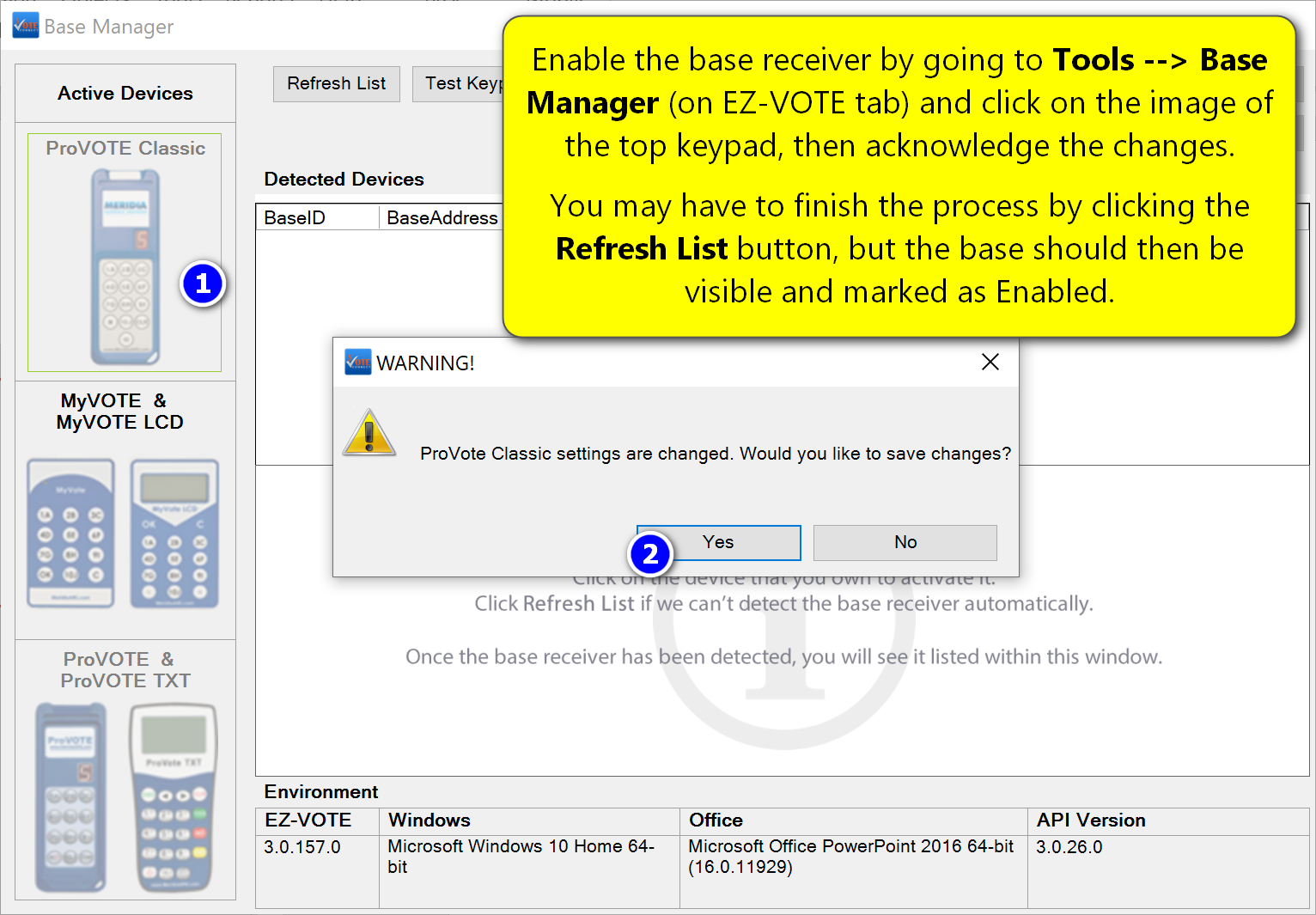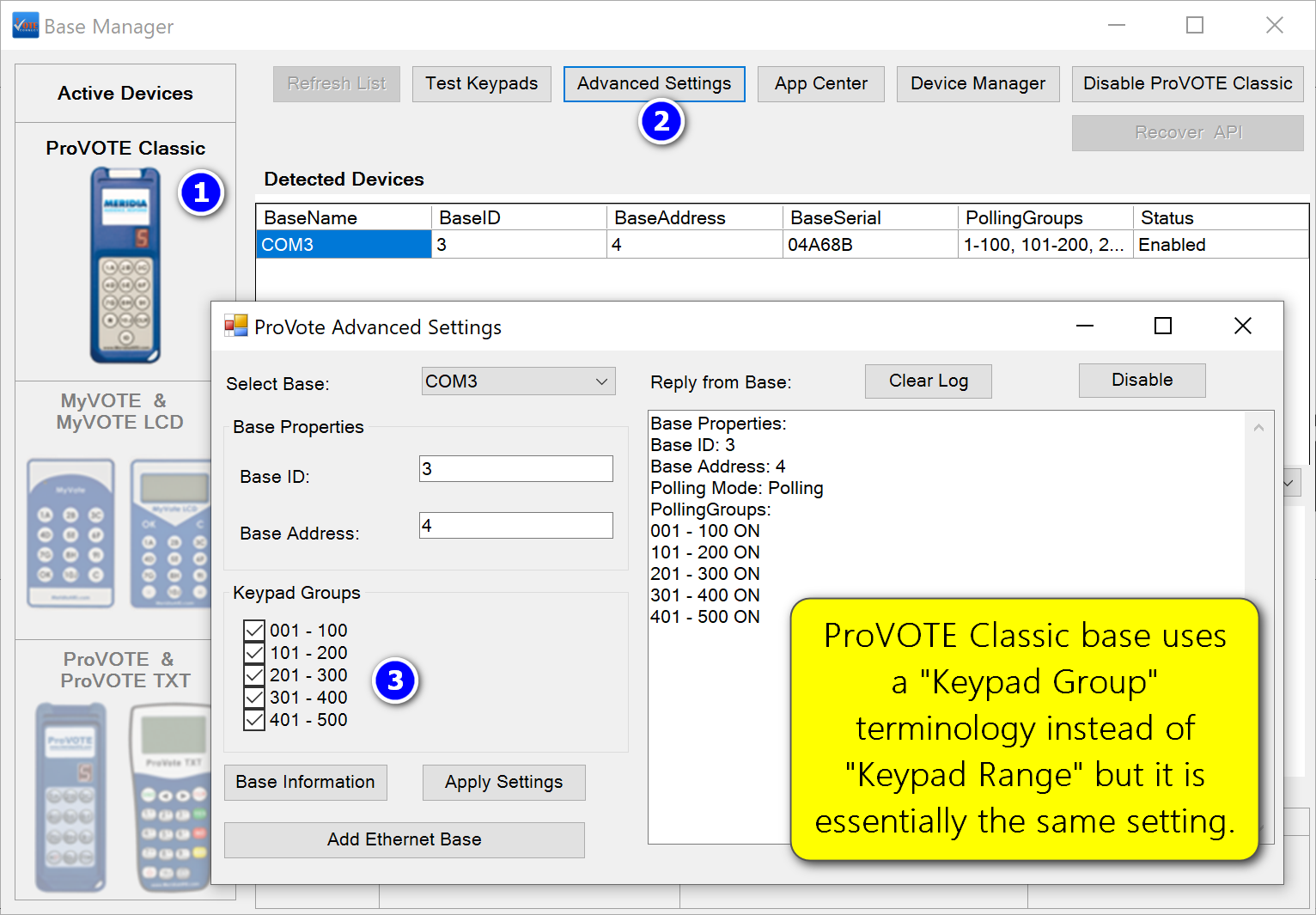 First, make sure that the ProVOTE Classic base has been enabled. Click on the image of the top keypad and follow the prompts. You may have to click Refresh List button if the base doesn't automatically appear in the list of Detected Devices: